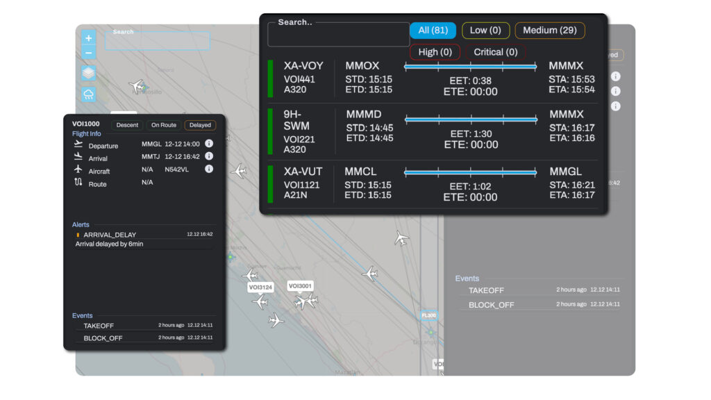 In‑flight awareness is strengthened through a consolidated view of flight information, real‑time alerts and event tracking, giving dispatchers immediate insight into the current status of each operation, including potential delays. Alerts are categorized into low, medium, high and critical levels, all fully customizable at an admin level to match operational policies. A detailed status window highlights key parameters and provides clear visibility into ongoing events, ensuring timely responses and consistent situational control.