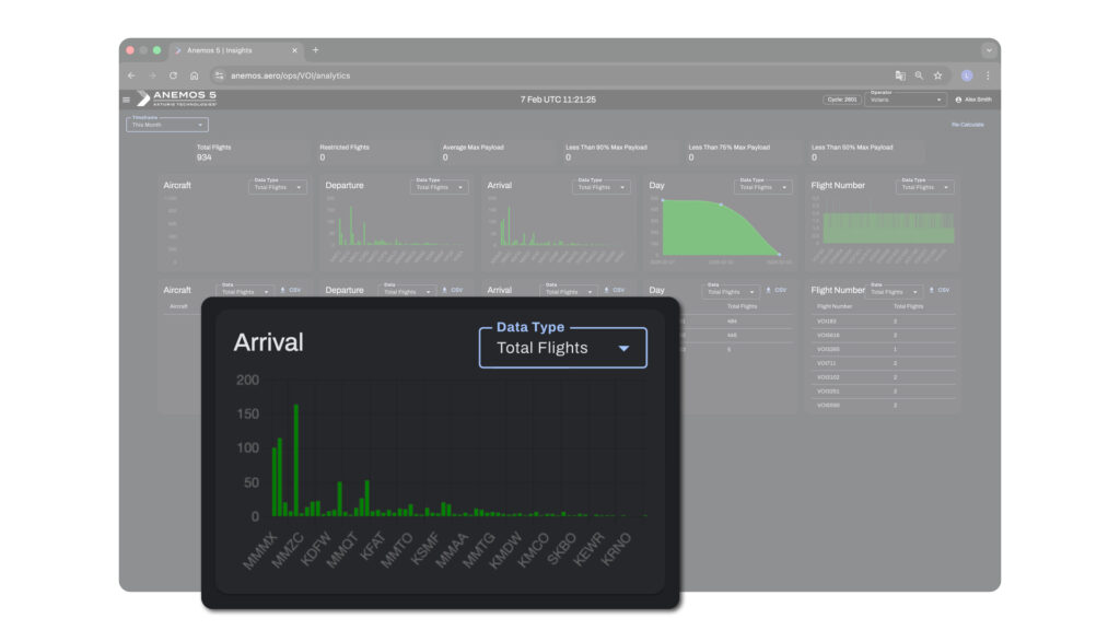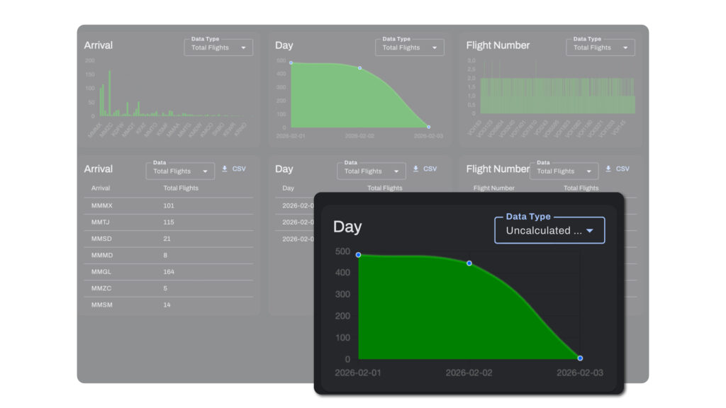The Insights module transforms raw operational data into meaningful analytics, revealing trends and patterns that support smarter route planning, performance optimization and resource allocation. A day‑to‑day metrics board visualizes the total number of operated flights across the entire fleet, with parameters fully customizable to each operator’s needs. Centralized data aggregation, intuitive trend visualization and flexible data export ensure that key operational insights are always accessible and actionable.