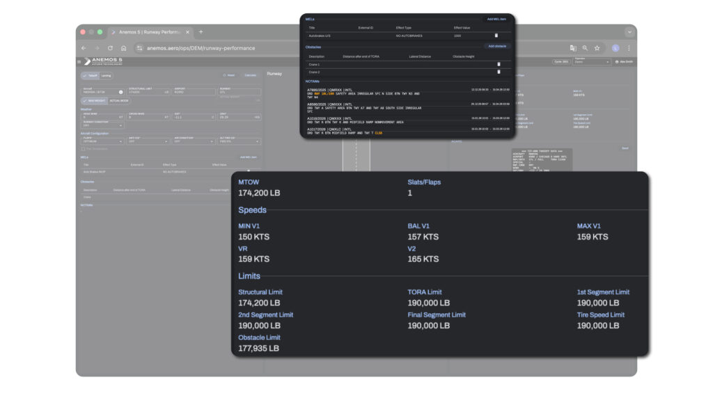 The Anemos 5 Runway Performance Module delivers instant, accuracy‑driven takeoff and landing calculations for airlines, GA and military operators. It merges aircraft performance data with real‑time weather, runway conditions, NOTAMs and operational constraints to ensure every scenario is validated with confidence and speed.